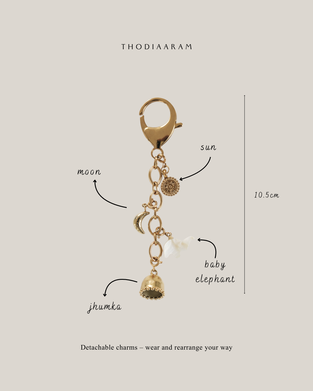 This bundle comes complete with a clasp and chain, along with detachable moon, sun, baby elephant and jhumka charms.